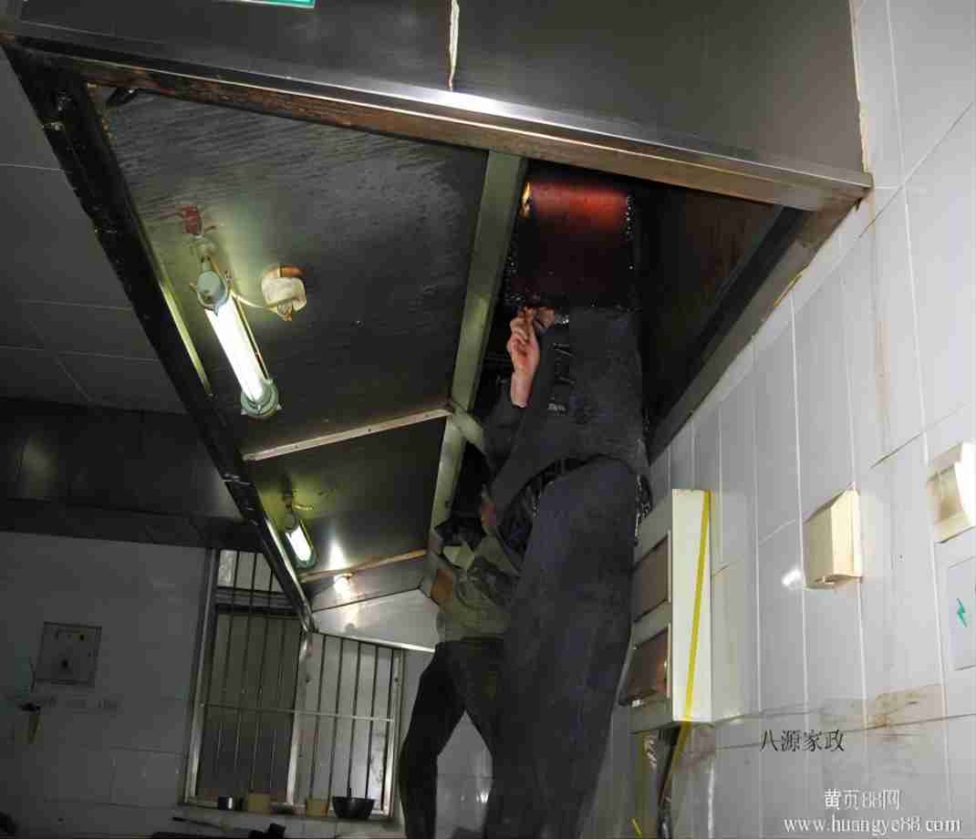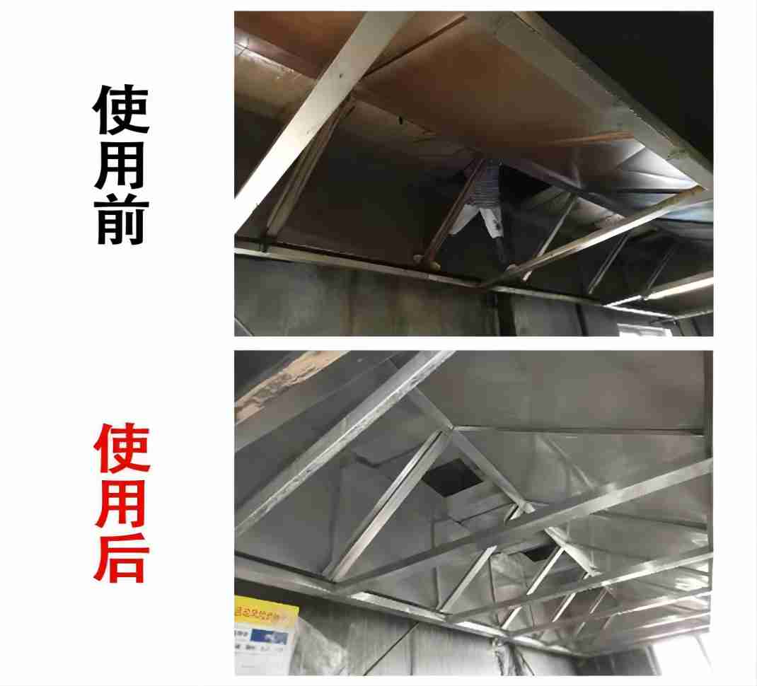 1、烟罩同步烟道90%以上可以见到烟道原有的内壁铁皮色,不残留块状干涸油污。